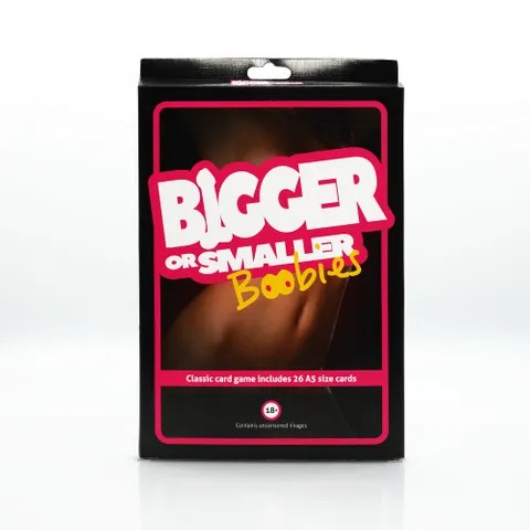 he game starts with the dealer flipping over a card to the player on their right. This player must then guess if the boobies on the next card will be bigger or smaller. If the player gets it wrong, he/she drinks a shot or drinks for the number of seconds corresponding to how far their guess was off; or simply add a truth or dare element, takes a shot or removes a piece of clothing.