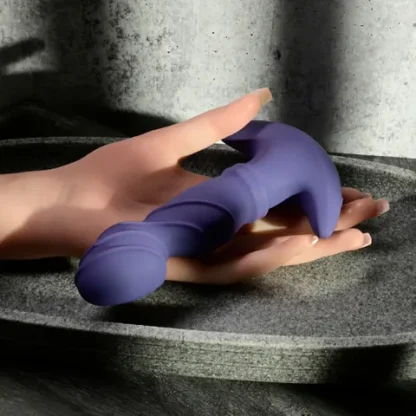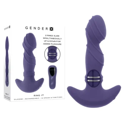 This deeply-textured rigid vibe features a prominent angled head and two sliding rings at its base that glide up and down in multiple speeds. The robust motors in the shaft can be operated separately either directly on the toy’s wide safety base or with the ergonomic long-range remote control.