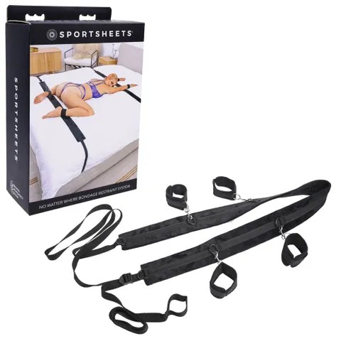 Surrender your body to entrancing restraints anywhere, anytime you want with the ultra-portable and adaptable No Matter Where Restraint System! Give your partner total control as you position yourself spread and restrained against the bed, or take your play to new heights by adjusting the straps to fit snugly against the door for standing bondage and tantalizing teasing.
